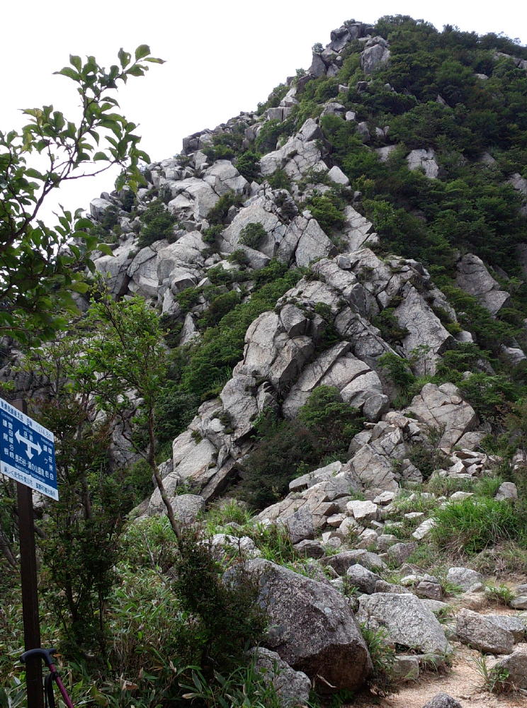 下流方向へ急傾斜を登り、尾根道と谷道の分岐で小休止していると、学生風の男女5人組が来て、「尾根道と谷道とではどちらが楽ですか?」と聞くので、「尾根道の方が楽だ。谷道は涼しいので、ワシはそちらにするけど」と答えたら、彼らは長石尾根の道へ向かった。