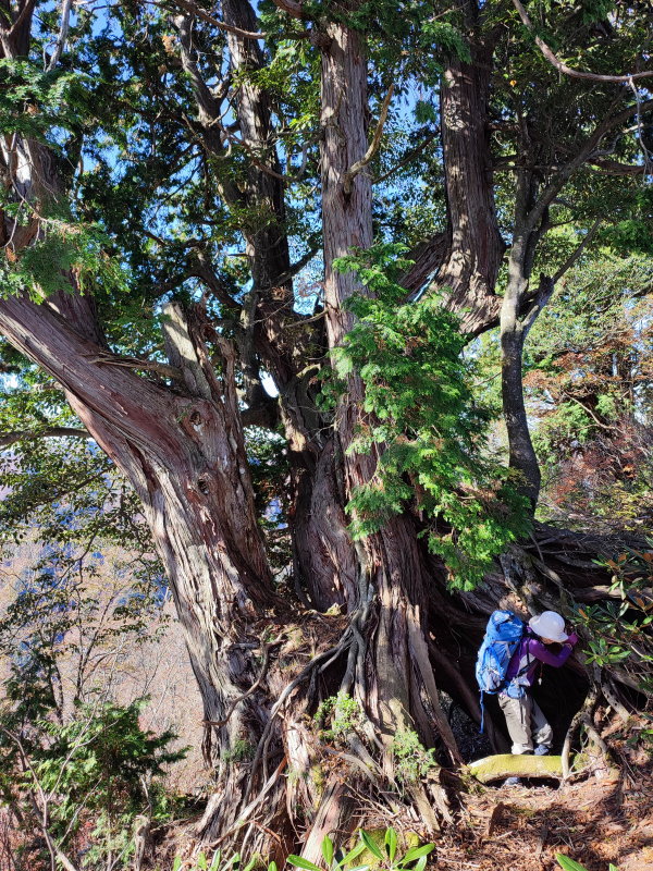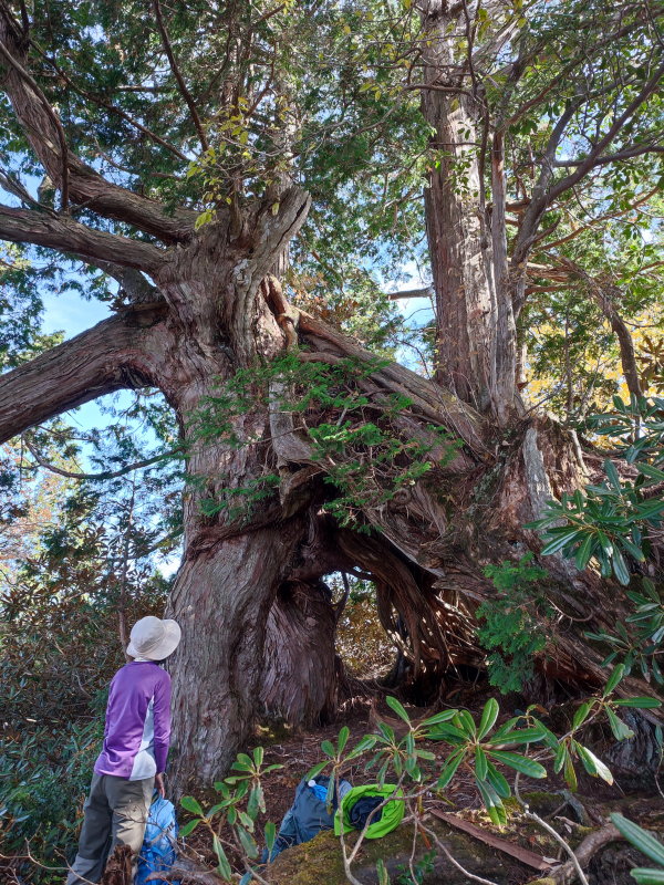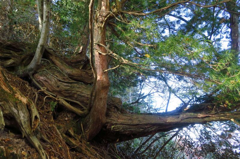 1132mピークを過ぎて、ついに目の前に現われたのは、5本の太い幹が足を踏ん張るように立つ、根上がりの巨大