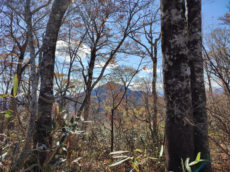 もう一本の巨樹を求めてさらに前進した。木々の間から目に飛び込んできた三角錐の山は屏風山だ。