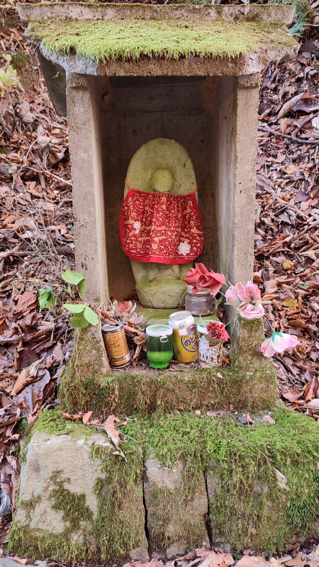 峠のお地蔵さまに挨拶をしてから、雨と夜露と寒さに備えて雨具上下を着込んで出発。