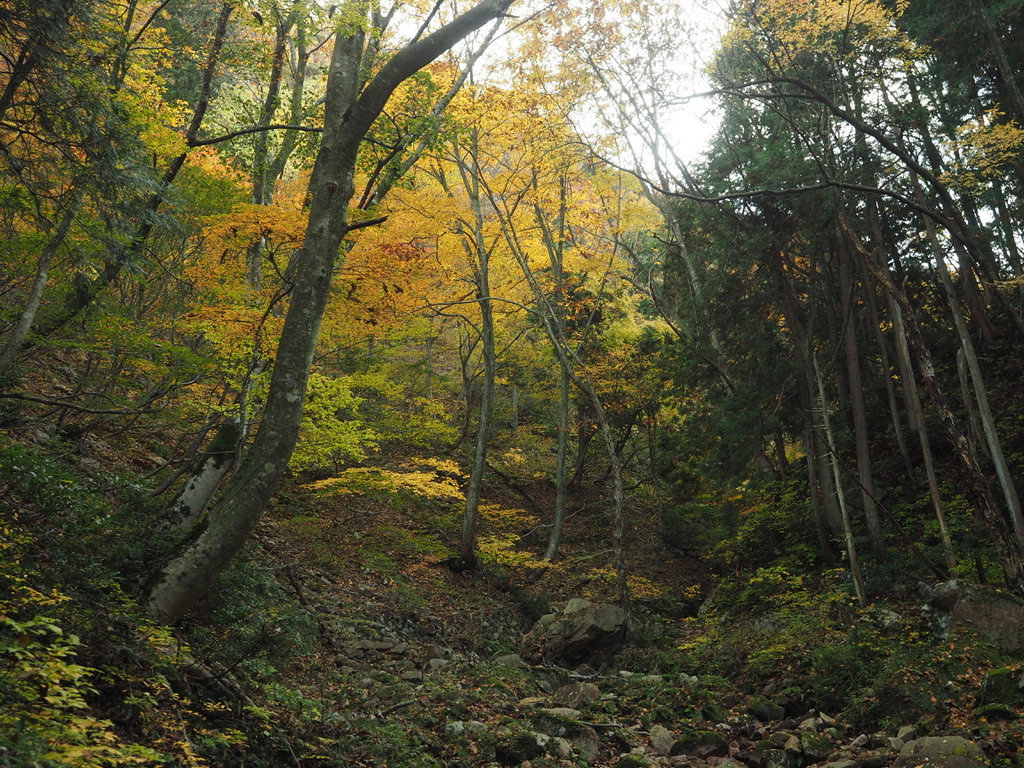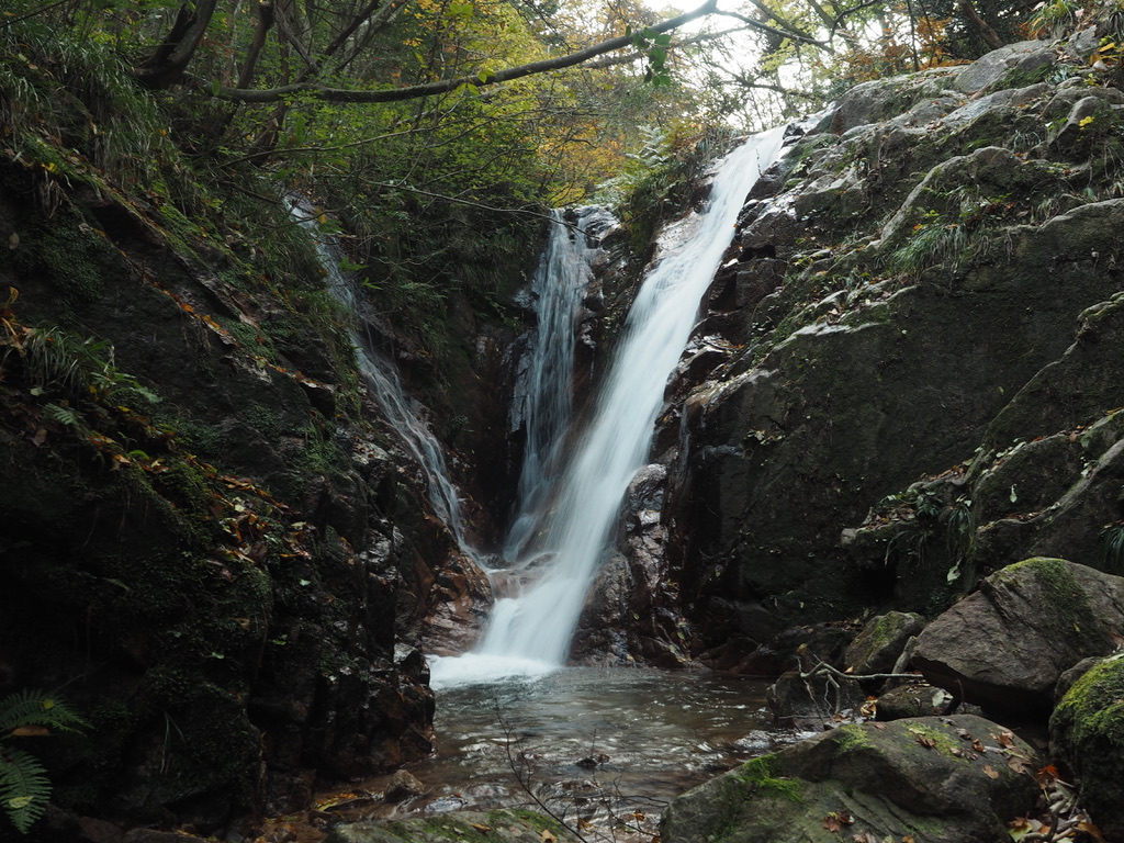 下るにつれて水量が増してくると沢から滝音が聞こえてくる。滝音に惹かれて沢に降りてみると谷の奥から三筋の滝が現れる。しばしば沢に降りては小瀧を愛でることを繰り返し、紅葉の渓相を楽しみながら下山する。