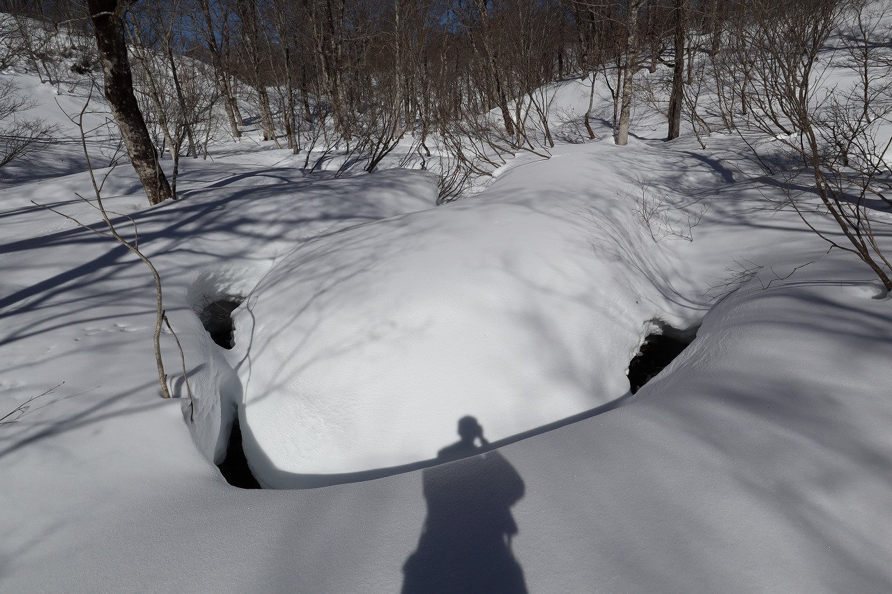 さあ帰ろう。ここは降り口から一番離れている場所。ほぼ降り口まで一直線であるが少々疲れてきた身にはわずかばかりの上り下りも堪える。気温が上がって雪の抵抗も増してきた。そして無心になって歩いていると、前方に大きな動物がヒョコヒョコ歩いているのを発見。カモシカだ。めったに人の来ないこの山で人間を見つけて驚いている様子。途中で一度こちらを振り向いたがすぐに林の中に消えていった。じっとしていてくれれば写真も撮れたのに残念。