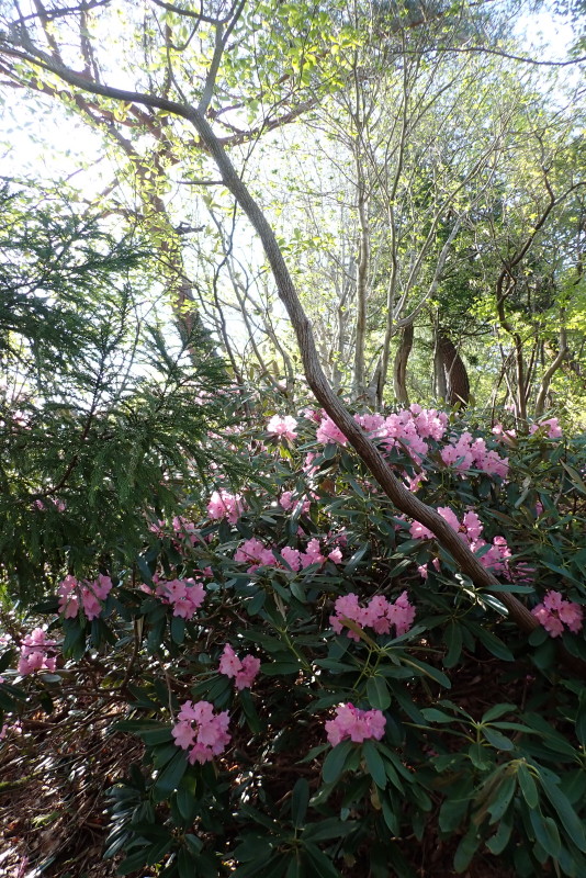 シャクナゲと並んでユキツバキの赤とミツバツツジのピンクもいいアクセントを添えていた。