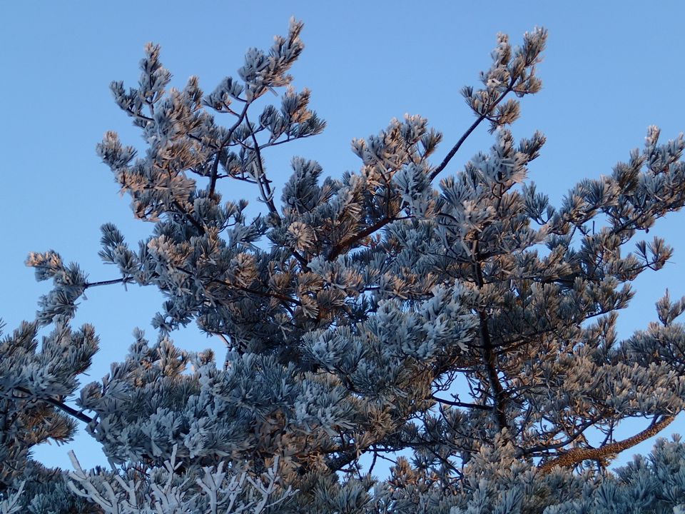 朝陽に輝く松の木の霧氷