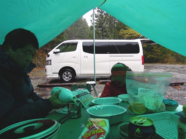 タープは独りで案外簡単に張れるものなのです。ただ、雨漏りタープ下の宴席をどうしようかと思案してました。