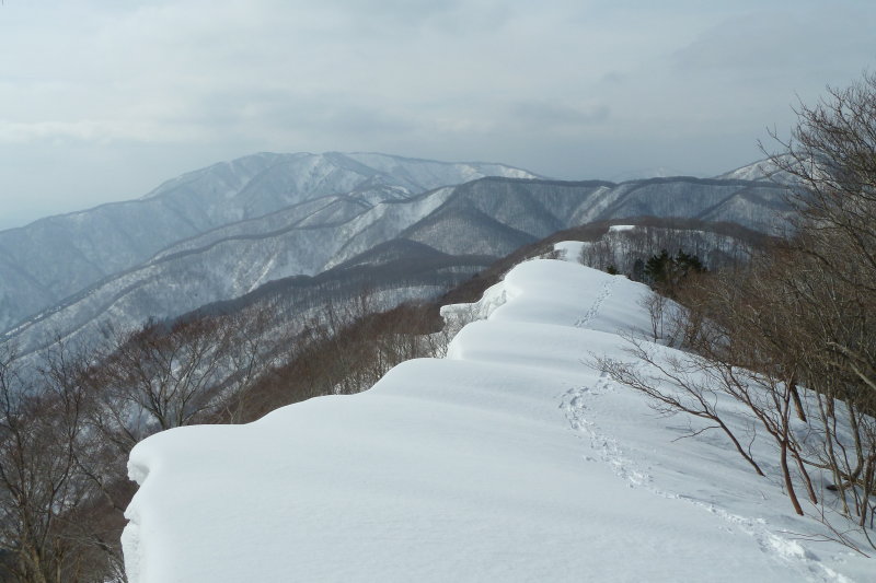 しかし、にゃんこヶ洞とは、ちと渋いですね。前に行ったときは、三角点のあるピークまでしか行かなかったのですが、その先のビューポイントがあるんですね。今回は忘れないようにしなくちゃね(もちろん、山日和さんは知っていることだろうから、そこまでご案内されることでしょう)。ピークは通過点のようなところだったと思うのですが、大きな雪庇ができていて、これを乗り越してピークに立った記憶があります。