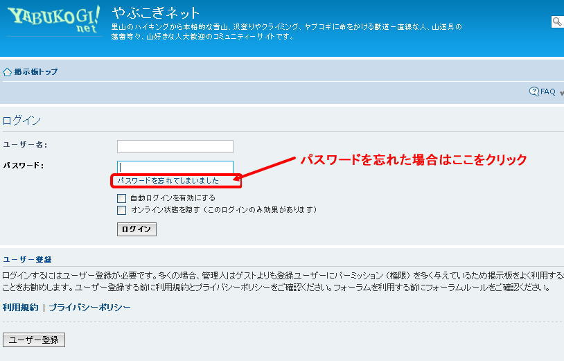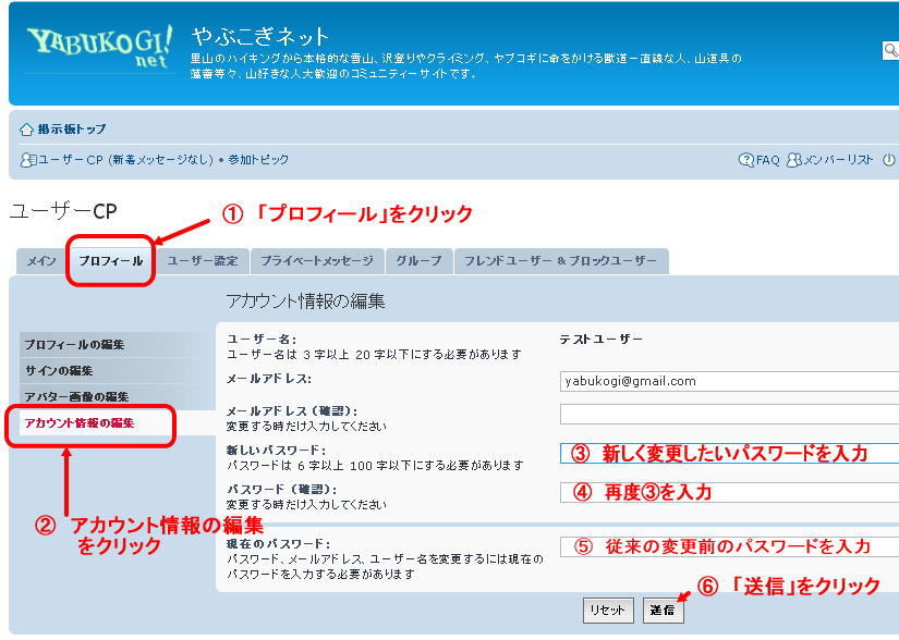 ユーザー名と登録時に使用したメールアドレスを記入する