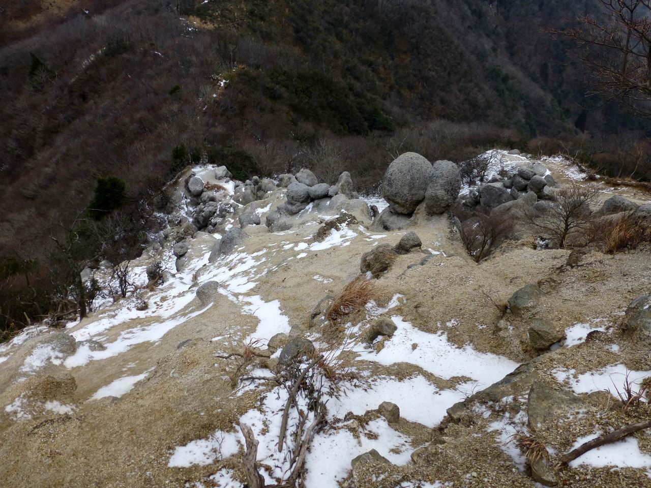 こでカズラ谷道と分岐し、雲母尾根に入り、まずは白ハゲに向かう。白ハゲは花崗岩のガレ場であり、滑らないように下り、左手に下