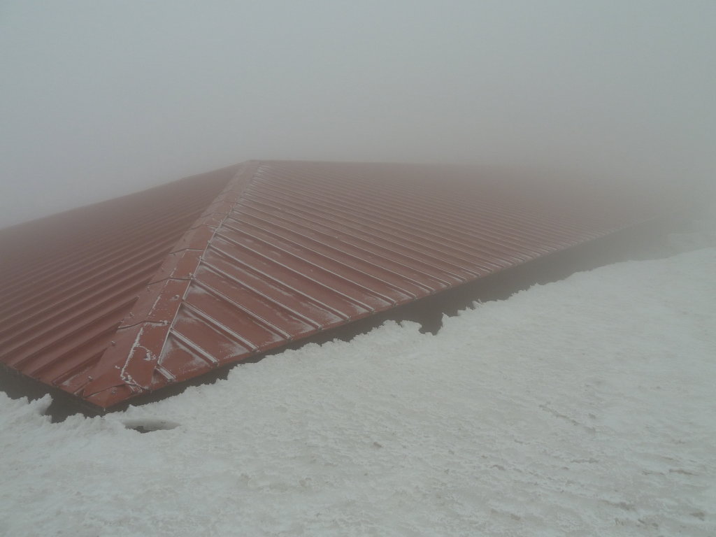 と言っても建物の中ではない。夥しい量の積雪と、建物の間の屋根に挟まれたわずかな空間である。5m以上は積もっいるだろう。ビールを飲む気にもならず、温かいカップ麺をすすって方針を考えた。10m以上の風とホワイトアウト。何度も登っている山頂へ誘う要素はなにもない。一番の安全策はこのまま平瀬道を引き返すことだが、それではなんのためにDOCを転がしてここまで来たのかわからない。