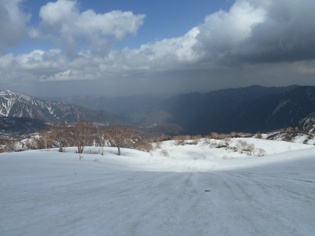 部の平原地帯が光っている。その奥には奥三方山と三方崩山が聳える。雪の量が増えてきた。ブナ林はダケカンバへと装いを変えた。振り返ると白いダケカンバが並ぶ雪面の向こうに、何とも言えない緑色の水を湛えた白水湖が静かに横たわっている。