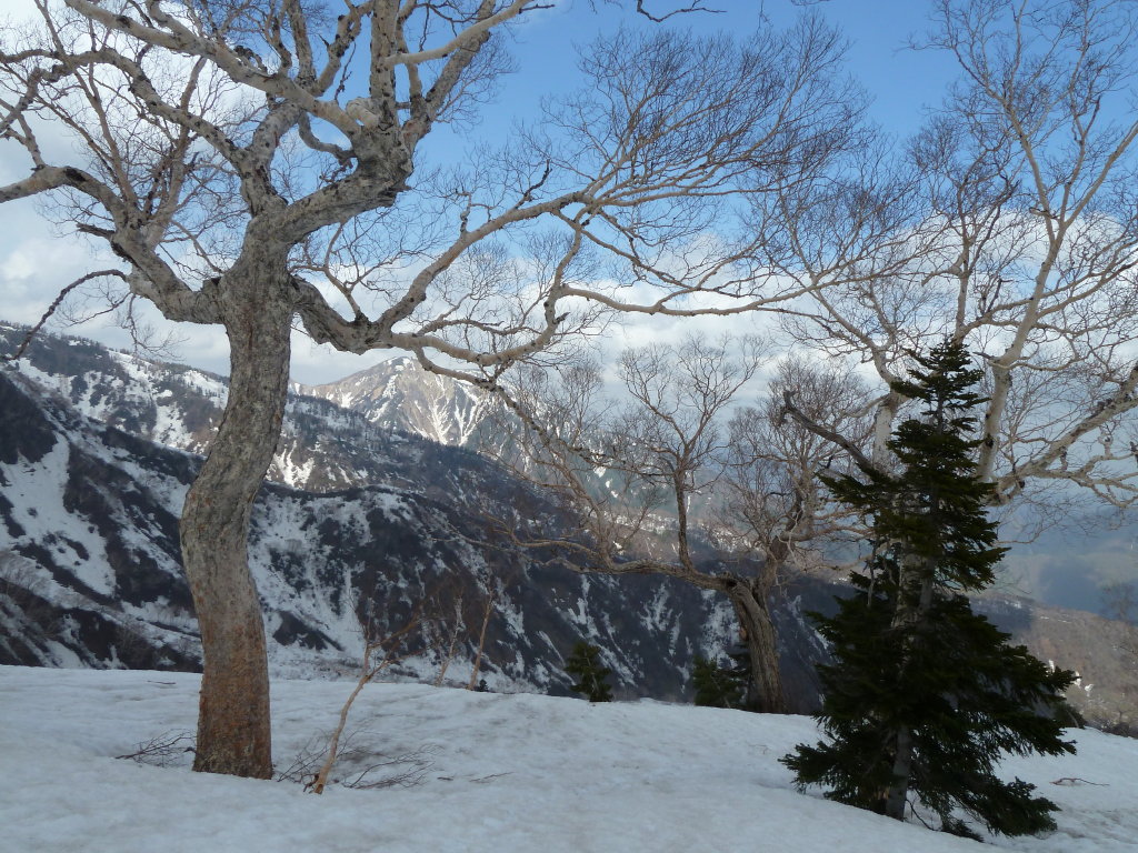 雪の量が増えてきた。ブナ林はダケカンバへと装いを変えた。振り返ると白いダケカンバが並ぶ雪面の向こうに、何と