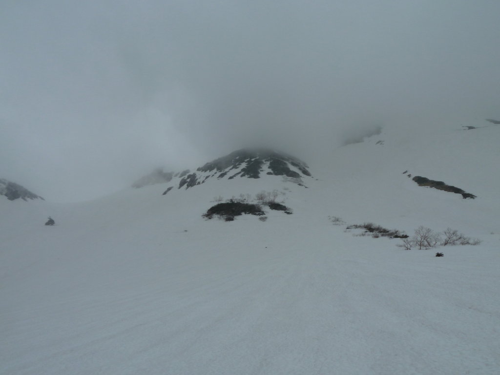 あらあら。雲に近づいてきちゃった?ところで、何で今回は、夏道を歩いてるん?雪がぎっしり詰まって、どこでも歩ける東面台地は、下山のお楽しみ?