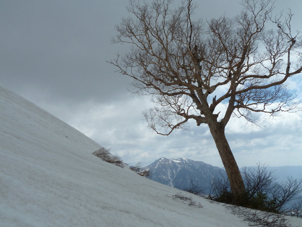 どこを歩くのも自在の東面台地。滑ったり転んだりしながら高度を落としていく。ダケカンバのモニュメントが至る所で存在