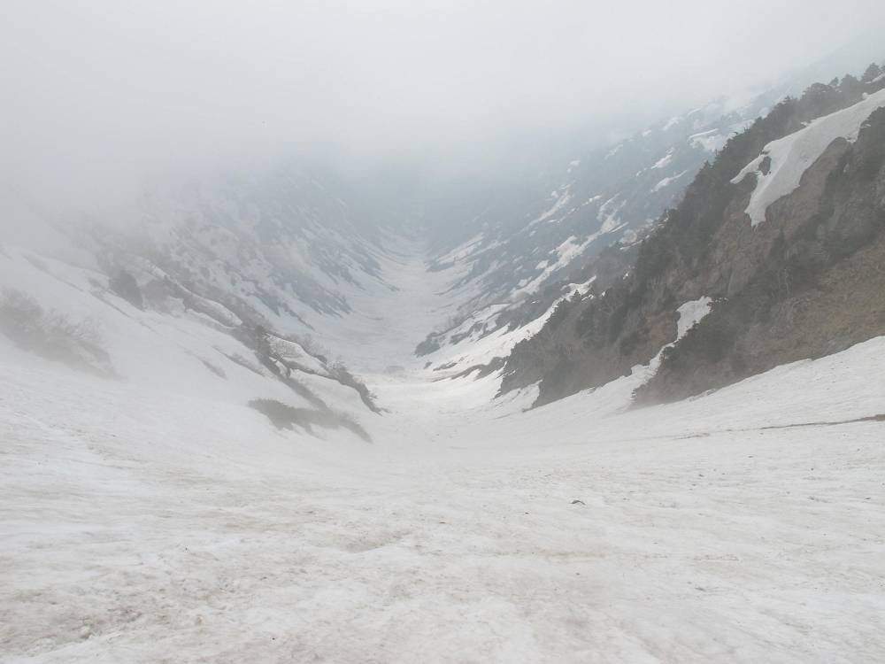 斜面に飛び込む。10m先も見えない急峻な雪渓は、ほとんど斜度がわからず恐いとも思わない。アイゼンは良く利いて