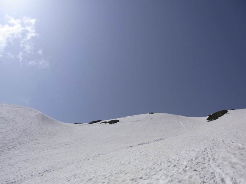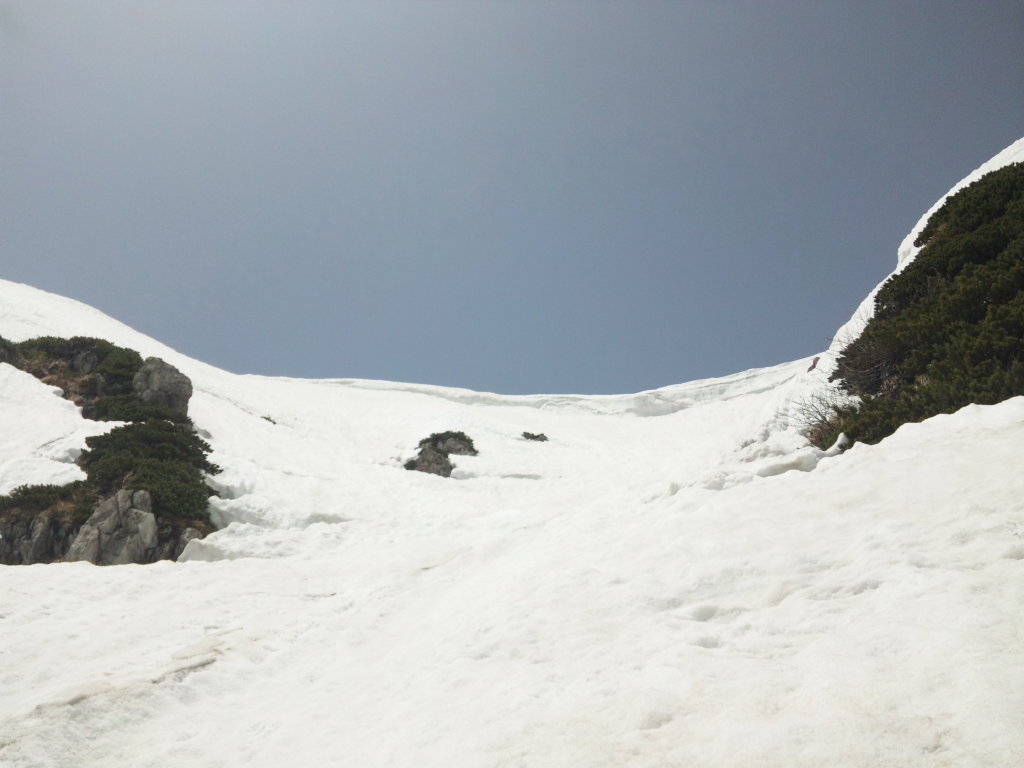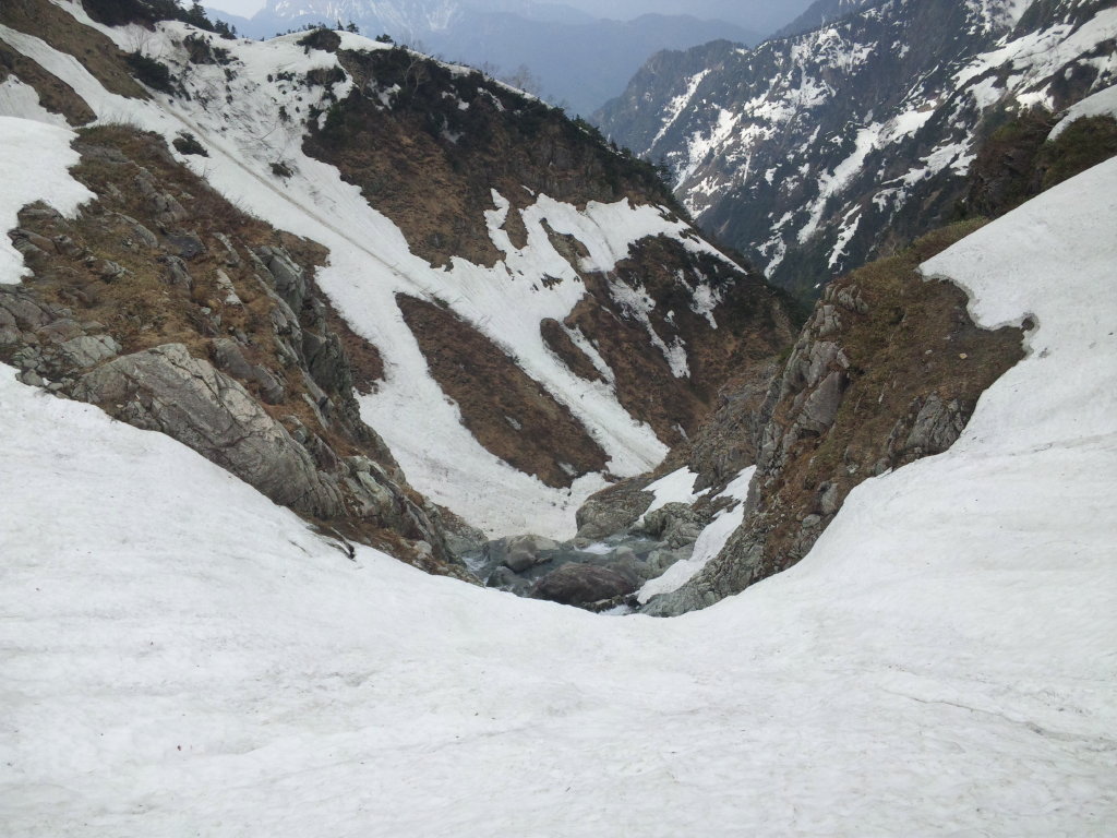 雪渓のど真ん中にクレバスができている箇所もいくつかあり、下だけ見て歩いているとクレバスにぶち当たって