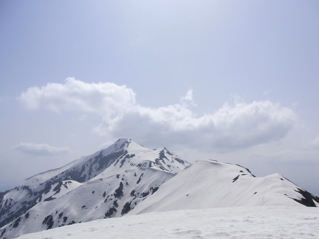 本日の目的である六ノ沢が正面に見え、笠への稜線に突き上げている、はずだが上部は雲の中。もうひとつ