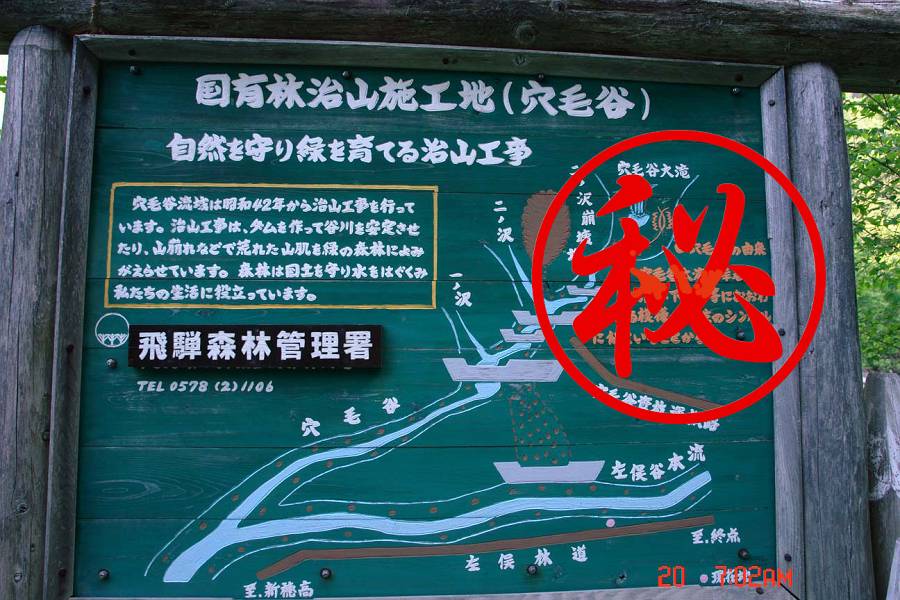 左俣林道を行く。2回目ともなれば、迷うことなく穴毛谷への林道へ導かれた。しかし例の穴毛谷の説明看板