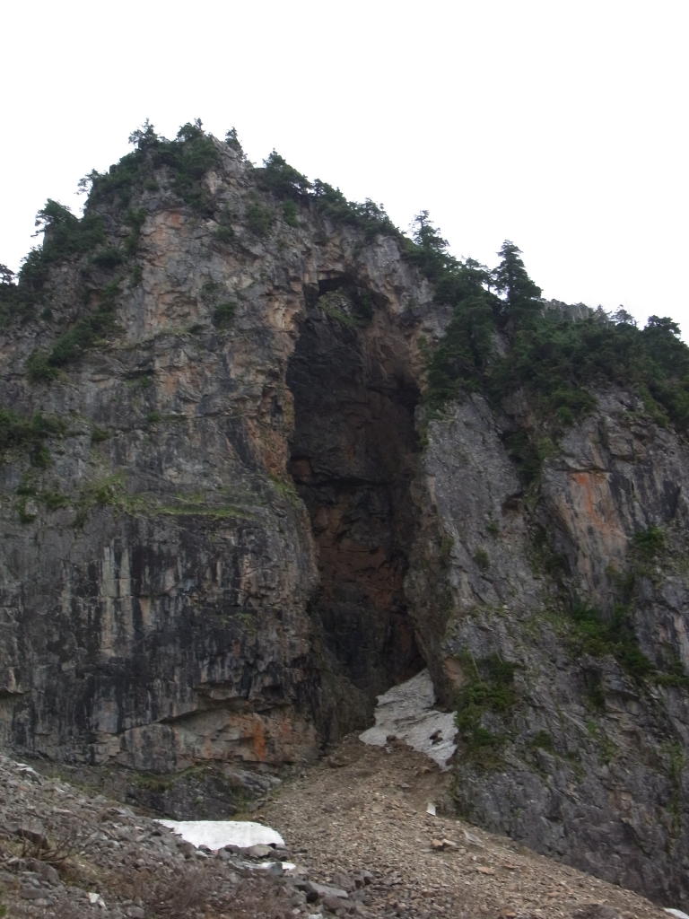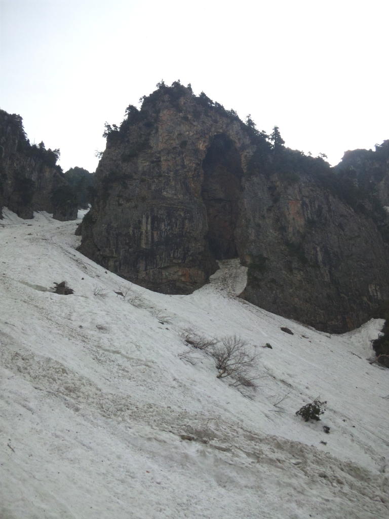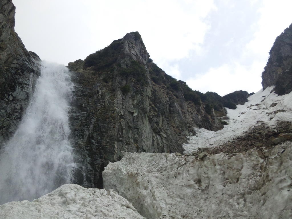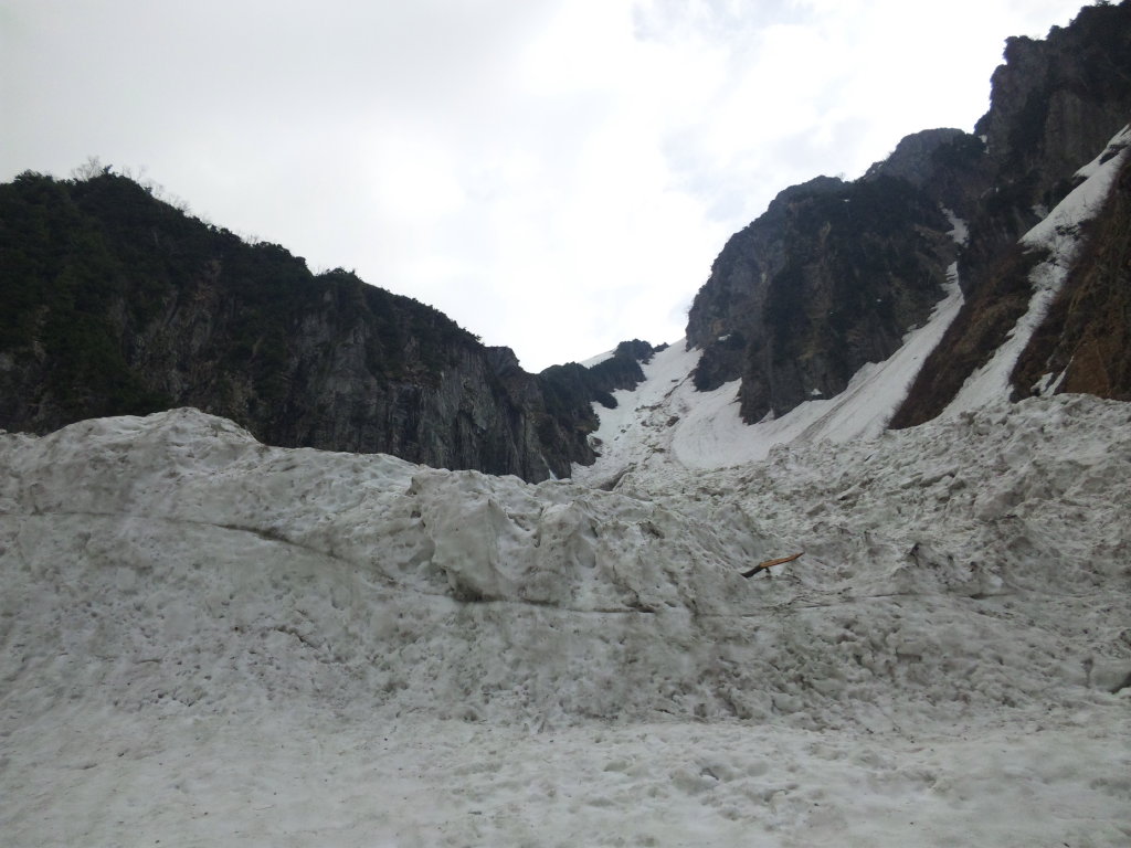 穴毛谷の象徴、御神体とも言える岩壁ももう感激は薄い。それより去年に比べて凄まじいばかりのデブリが