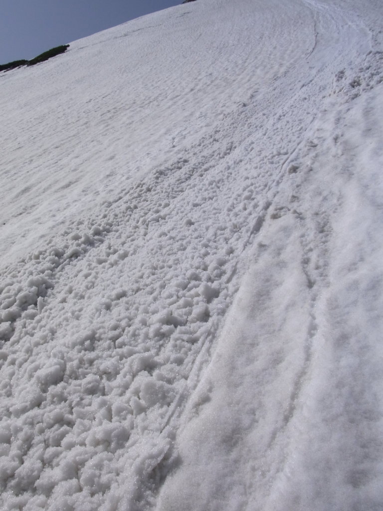 はなかった。足でブレーキをかけて立ち上がり、横に避けると幅1m、長さ50m、厚さ5センチ程度の雪の層はま