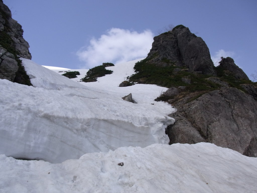 両側を露岩に挟まれたところに来た。おそらく無雪期は滝場なのだろう。横一文字にクレバスが開いている。