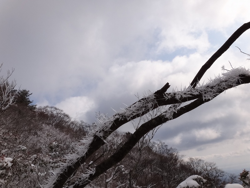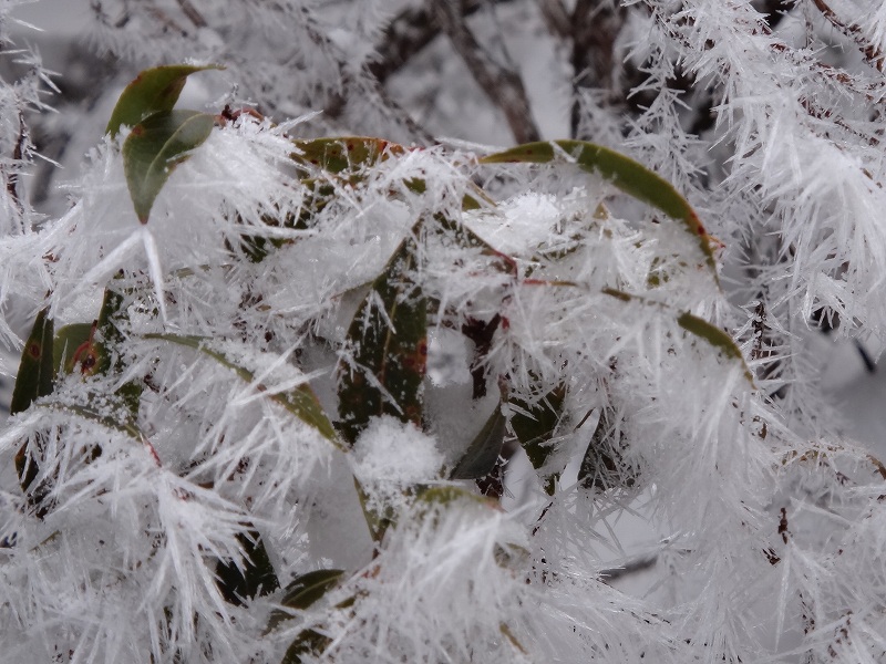 稜線上で不思議な氷の付き方をした木々に驚く、まるで針葉樹のように氷の結晶が発達していく、こんなのもよく見てみると珍しく楽しいものだ。