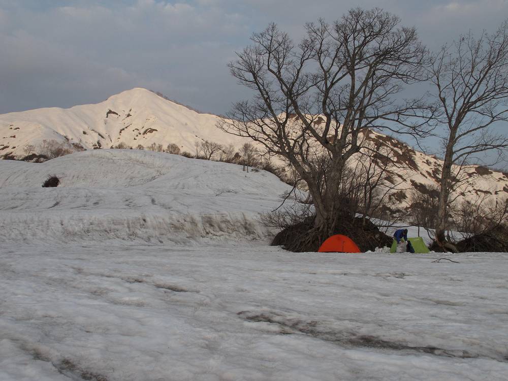3日(火) 笹倉温泉登山口 12:45---アマナ平 15:40 ---BC(北面台地1250m地点) 16:40