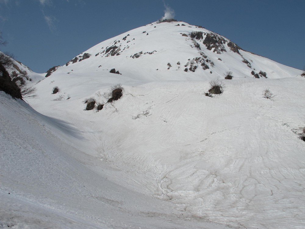 焼山がま~るくきれいなオッパイ山に姿を変えると溶岩溝の中から抜け出し、影火打へと延びる沢の入り口にたどり着いた。