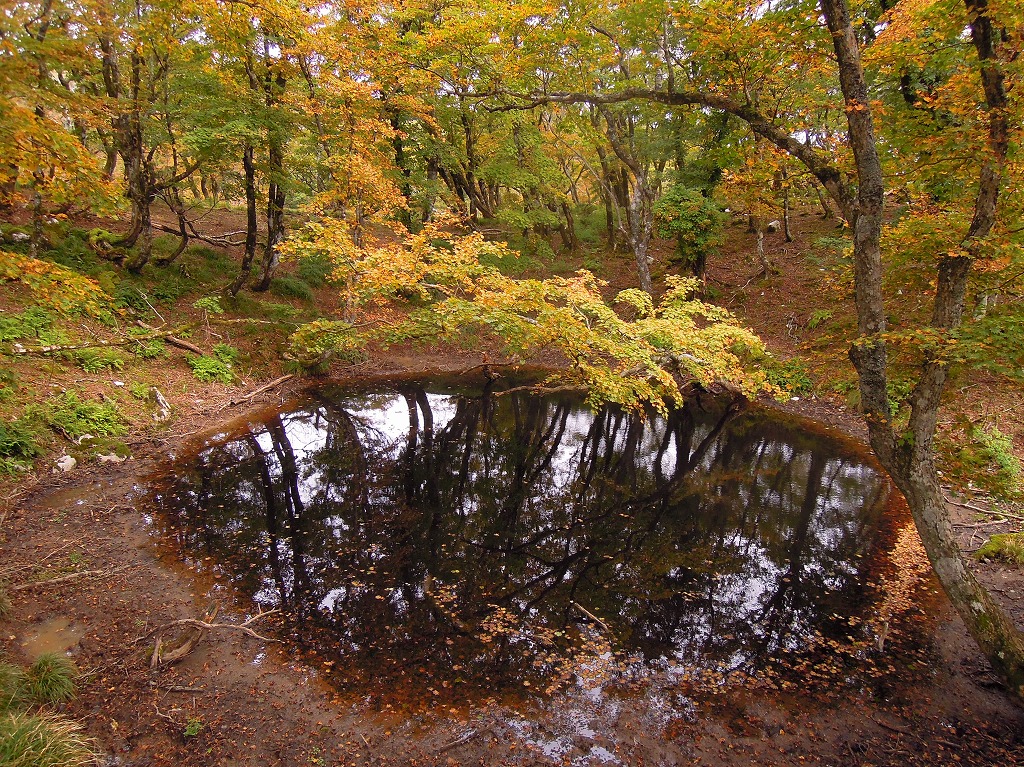 食事のあとは青のドリーネから幸助の池に回る。ずいぶん紅葉も始まっている。池がきれいだ