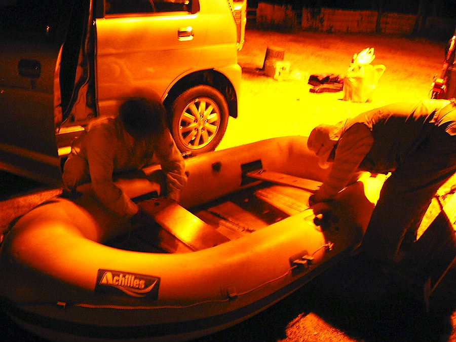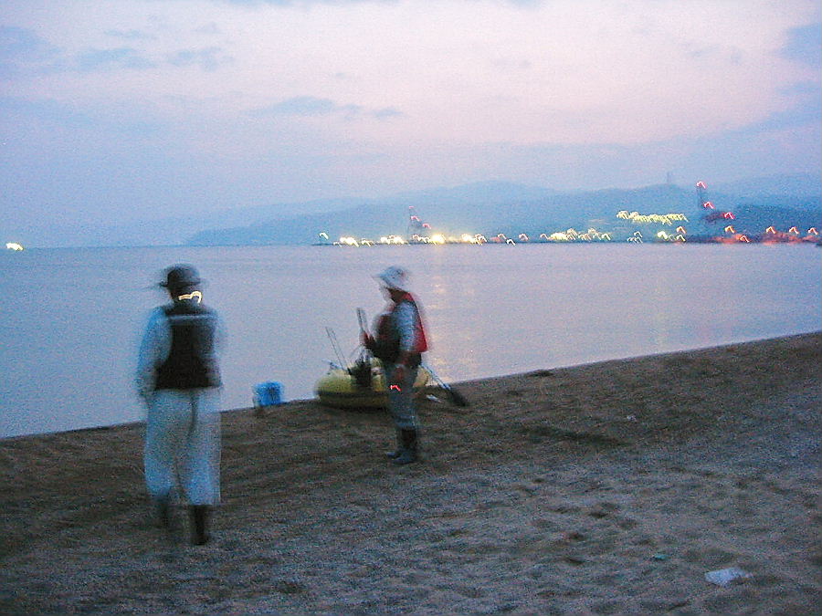 熟年夫婦が犬連れでアチコチ旅してるんだ、にこやかなご夫婦だココでキス釣りするんだと準備中です
