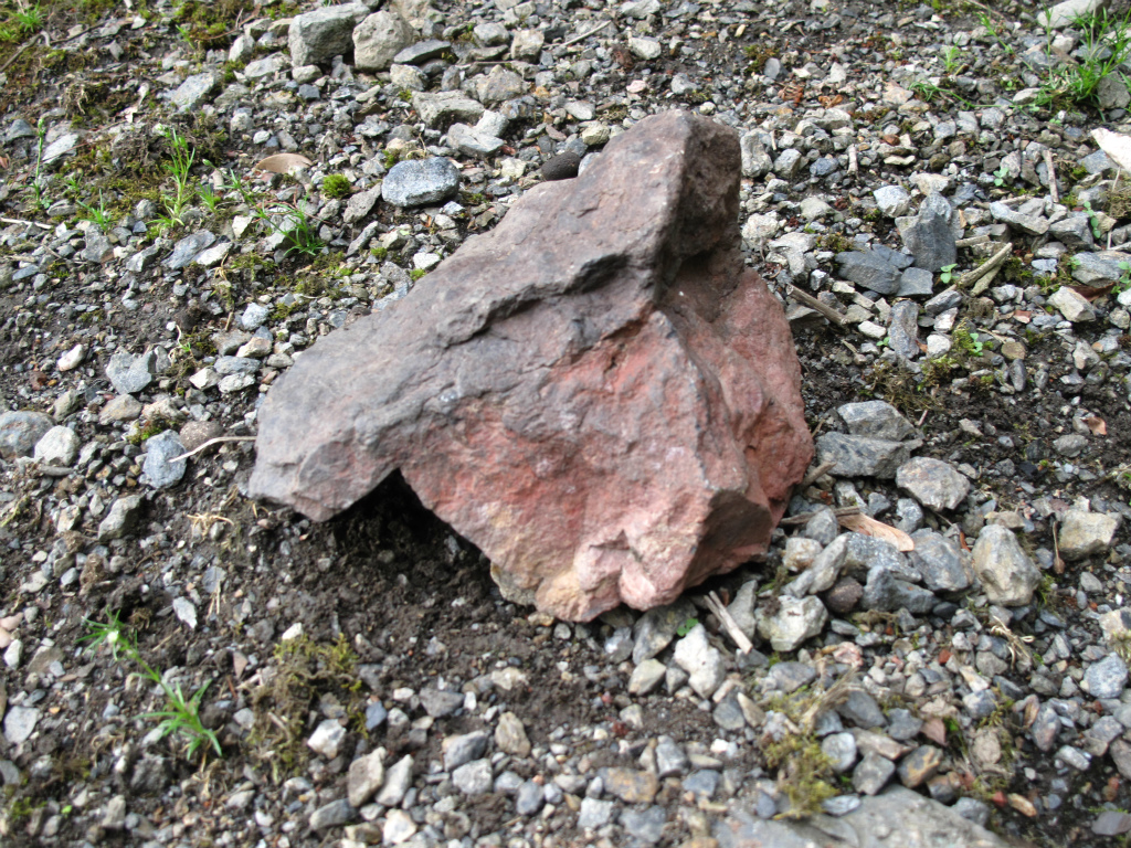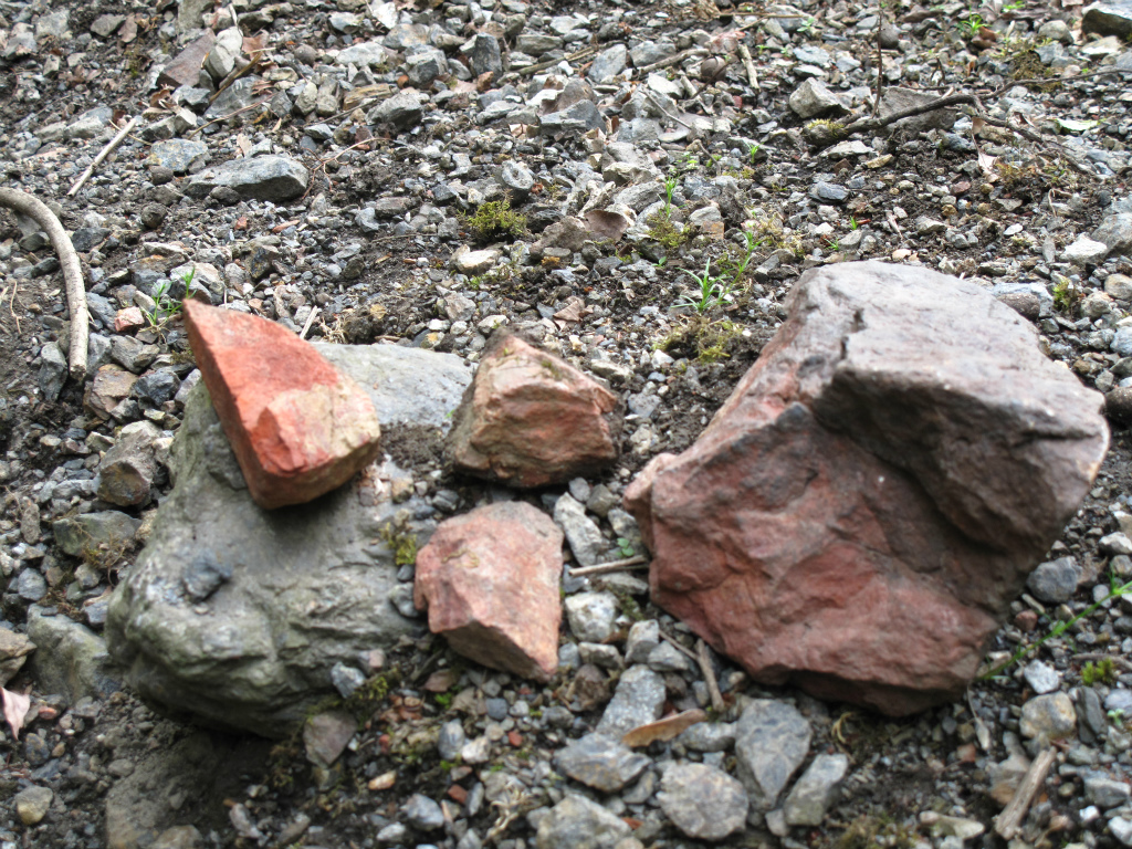 焼口の中や、周りの石を調べ始めると「これだな。」とレンガ色の鉱石を手に取った。辰砂(しんしゃ)