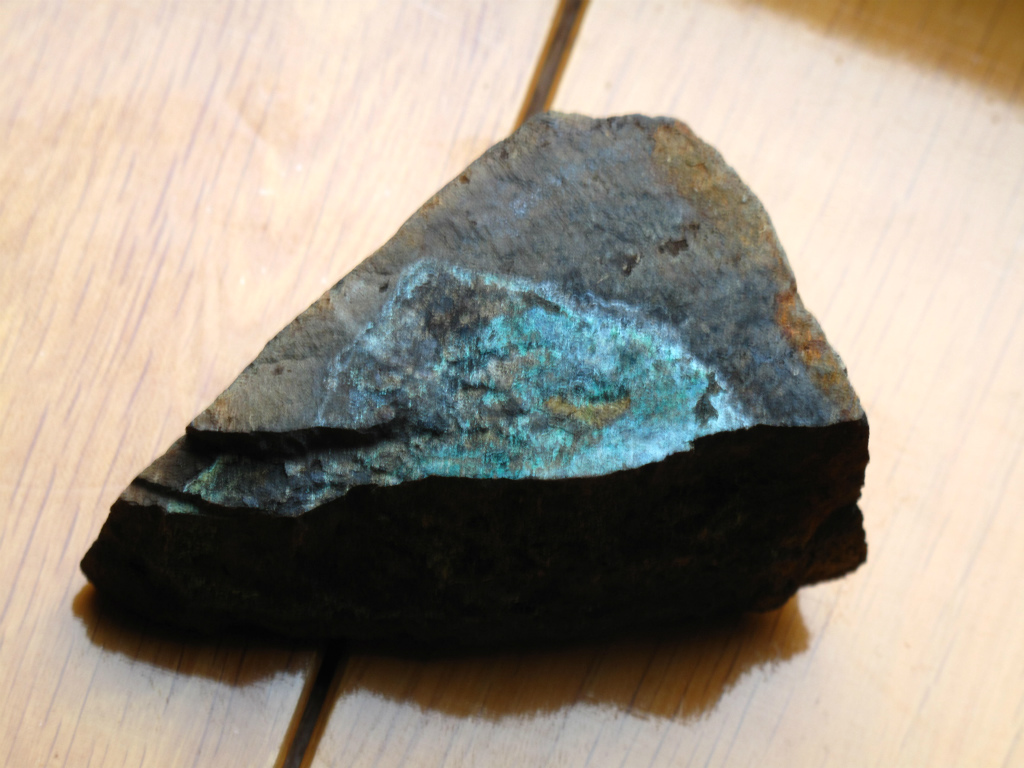 緑青は銅の青緑色のサビの事で、この滝の上部の中尾に緑青岩が南河内絵図(1774年)に画かれており、ここからきたようだ。桧谷銅山の鉱脈を暗示するかのような青緑色の岩は特別な意味があったようだ。私はこの岩の青緑色はコケだと思っていたのだが、Kさんによると銅の緑青が浮き出ているのかもしれないということだった。緑青の浮き出た岩がいくつか落ちていたそうで、今回はその一つを採取してきた。地質学の専門家のいう事には説得力がある。