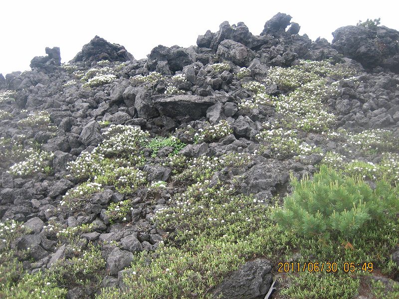 黒い溶岩に映える満開の白いイソツツジの大群落がすばらしい。