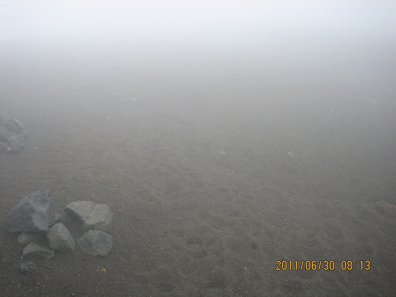 ここからしばらくはスリバチ火口とグランド火口の間の稜線歩きとなるが、な~~んにも見えない。足元の砂地に感心しながらケルンや岩に記されたペンキマークを頼りに歩く。もう10m先が見えない。風は風速20mぐらいになってるんじゃないだろうか。ガスが稜線をビュンビュンわたっていく。ズボンのすそもバタバタし始めた。帽子も飛ばされないように何度もかぶりなおす。