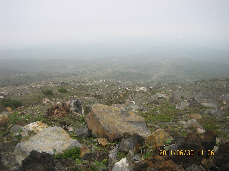 帰路はもうずいぶん下のほうまでガスで覆われてしまっていた。避難小屋あたりまで来るとやっとガスも取れて広大な景色が裾野へと広がっている。不思議に風もパタッとやんでいる。地形のせいだろうが、こうまで風がなくなるのはキツネにつままれたようで面白い。