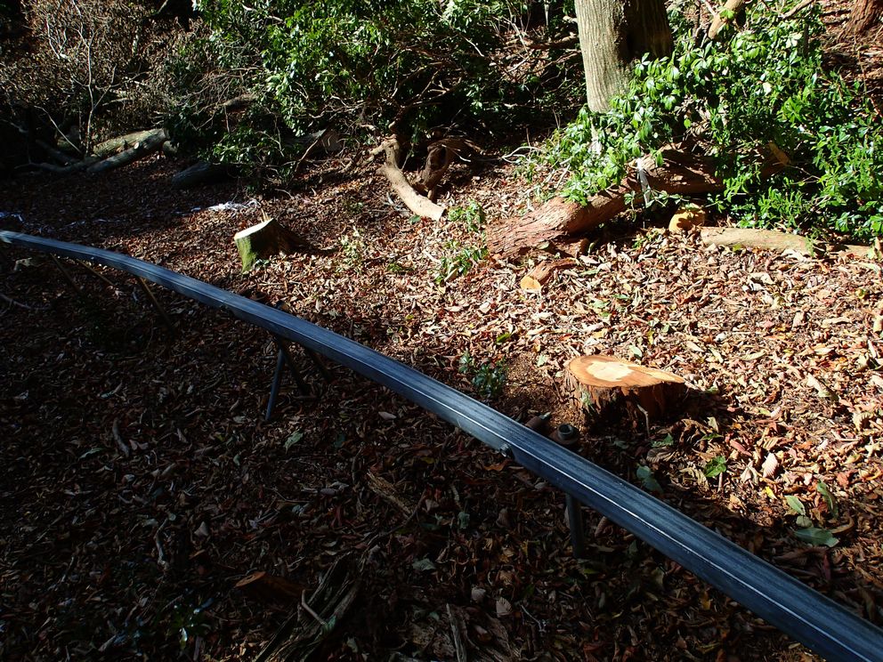 レール敷設のために沢山の木が切られていたのは残念だが、そのまま放置ではなく何等分かにして傍らに積んでいたのは丁寧な仕事と言えるだろう。