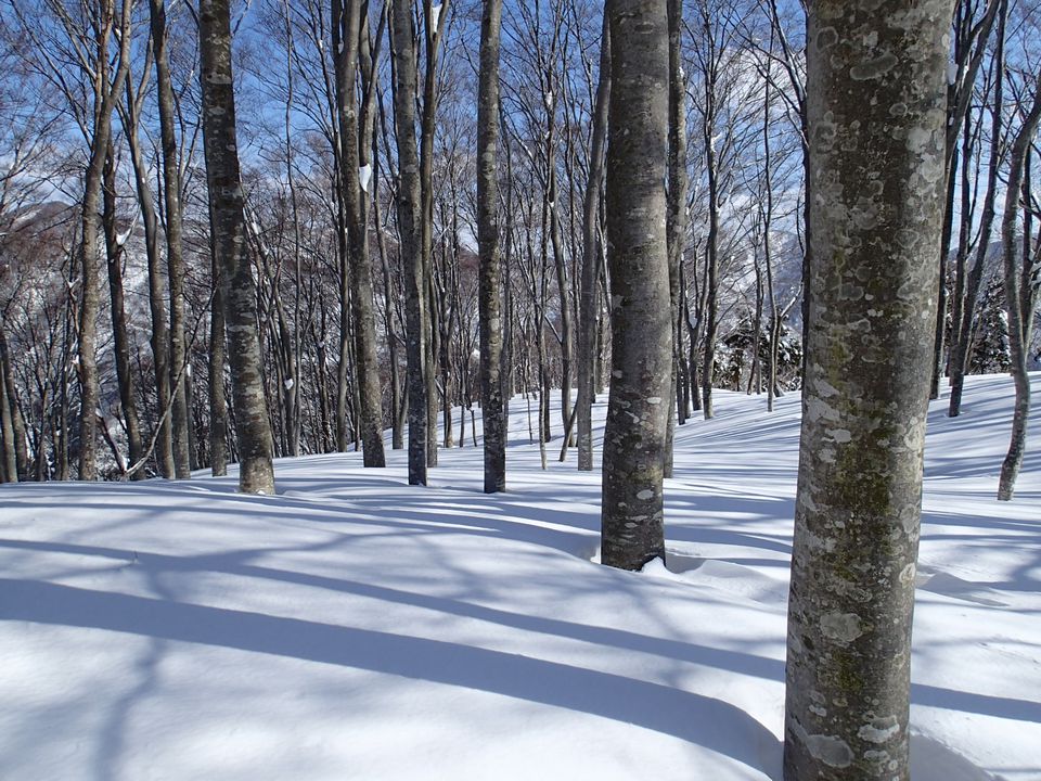 東尾根のコルに登り着いて、ここからは西進になるが、あまり太いものはないもののブナだらけの素晴らしい尾根だ。相変わらず歩みはのろいままだけど、そんなブナに力を貰って前進あるのみ。