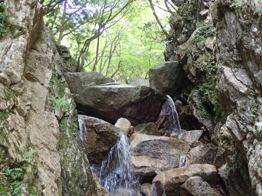 その奥のゴルジュ内に溝状滝。一見難しそうだが、左右の壁に両手両足を突っ張って取り付けば、あとはフリクションを利用して簡単に登ることができる。ここもロープを出しても良かったのだが、支点をとっている間にシャワーを浴びそうだったのでフリーで登ることにする。落ちても死ぬことはないが、落差があるので、落ちないように慎重に登る。1段目の上もゴルジュの滝が続き、中の谷では一番楽しませてくれるところかも知れない。最後の大岩の乗越しはちょいムズで、両足を突破ってステミングで登るのだが、楽しい。登りきって雄叫びをあげる。