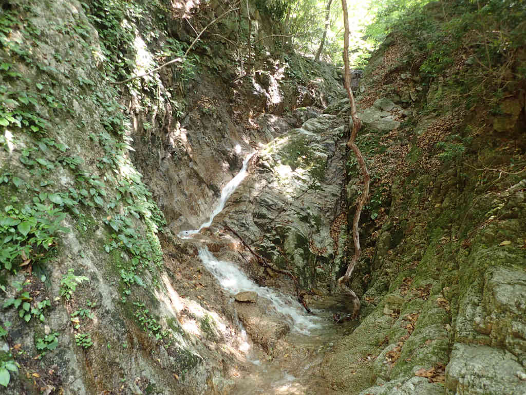 その奥のゴルジュ内に溝状滝。一見難しそうだが、左右の壁に両手両足を突っ張って取り付けば、あとはフリクションを利用して簡単に登ることができる。