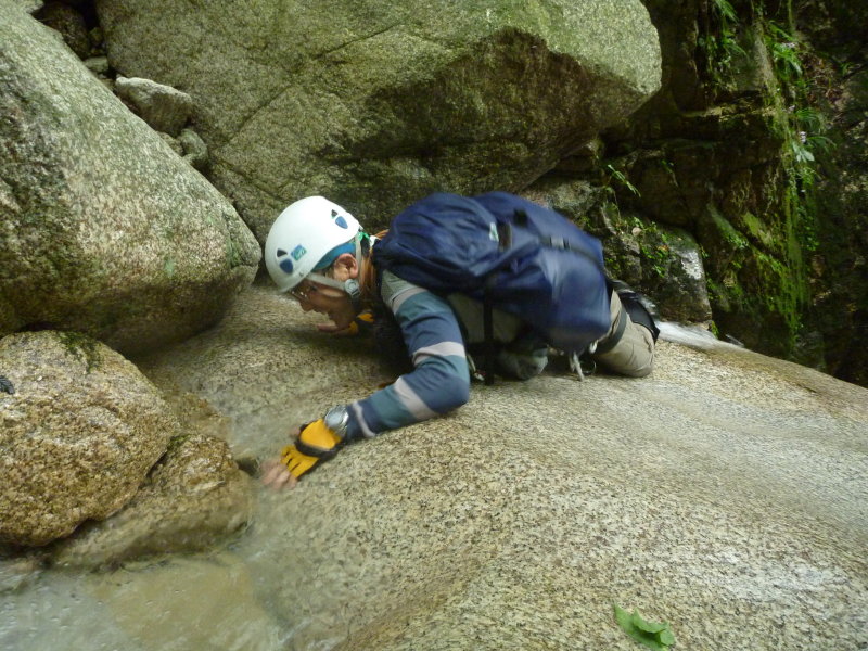 次はシャワーの滝6m。通常はシャワーを浴びながら右から左へ斜上するのだが、シャワーを避けて左から上がったらそのまま核心部を過ぎてしまったので、フリーで登りきった。