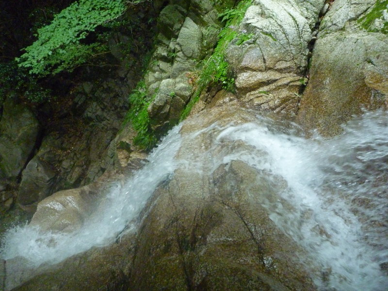 その奥のゴルジュ内に溝状滝。一見難しそうだが、左右の壁に両手両足を突っ張って取り付けば、あとはフリクションを利用して簡単に登ることができる。ここもロープを出しても良かったのだが、支点をとっている間にシャワーを浴びそうだったのでフリーで登ることにする。落ちても死ぬことはないが、落差があるので、落ちないように慎重に登る。1段目の上もゴルジュの滝が続き、中の谷では一番楽しませてくれるところかも知れない。