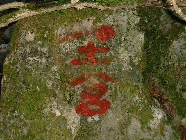 ペンキの文字は、見当たりませんが、分岐点の木にテープが巻いてあります。以前は、ポリ袋に入った案内がありましたが、今は案内のようなものは一切ないですね。分岐点は石にペンキで書いてあったような記憶がありますが、今でもあるのかな?