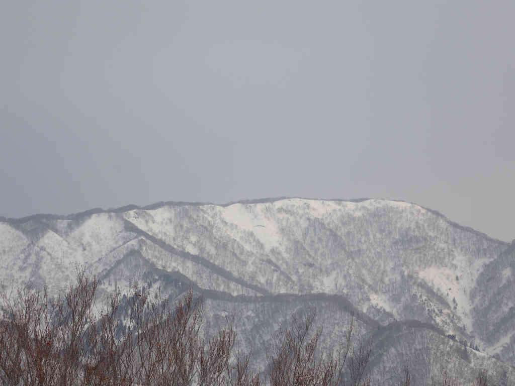 2キロほど歩くと地図には記載されていない橋があるはずなのだ。おっとっと、そんなことを書いているうちに橋を通り過ぎてしまったようだ。少し引き返して林道が右折するところのカーブミラーのところを入ると左のほうに橋が見えた。橋の上には欄干のかなり上まで雪が積もっているが、幅が十分にあるので危険なことはない。 橋を渡ってすぐの斜面に取り付く。しばらくは急登。まあ、これくらいはスノー衆で鍛えられているのでどうということはない。後ろには明日歩く予定の大ダワから土蔵岳の稜線が綺麗に見えている。 しばらく登ると痩せ尾根。雪庇が発達しているので、雪庇を踏み抜かないことだけを気をつけて突破する。 橋から1時間ほどで北尾根の875m標高点あたりに出た。駐車地からここまで約2時間。まあいいペースだろう。ここで栄養補給のため大休止。朝、晴れていた空は曇り空に変わっている。天気が予報より早く動いているのだろうか。 稜線上にはまったくトレースなし。先週の女性はここまで来たのだろうか。あるいは途中で引き返したのか。時刻はまだ8時半。3時間ほどで上に着くだろうか。稜線上はブナ林になっていて雰囲気がいい。長い稜線だが、ルンルン気分で歩いて行く。