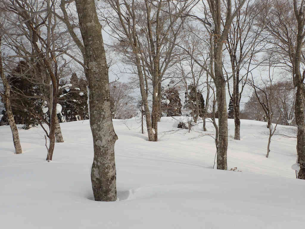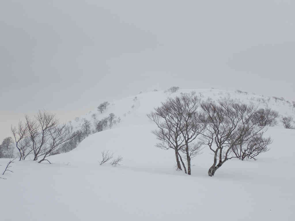 1050m付近で、金糞岳ピークを見つける。あと1時間ほどで着くだろう。標高が高くなるにつれて大きな木がなくなり、白銀の稜線になる。ピーカンだったら綺麗だろうなと思いながら歩くが、それは贅沢というものだろう。 ピーク手前で白倉岳頂上に単独者の人影を発見。こっちに歩いてくるようだ。11時、頂上着。冷たい風が吹いている。風を避けるため南斜面を少し降りて休憩する。手袋を脱いだ指の感覚がなくなってくる。どうもここで昼食は無理なようだ。頂上に戻ると山スキーの単独者がいた。さっき白倉岳にいた人だろう。しょっちゅう山スキーをやっているらしく、顔が十分に雪焼けしている。下山後にわかったが、ヤマレコでよくこの辺りのレポを出しているsocksさんだった。実はこのコースはsocksさんの最近のレポを参考にして決めたのだ。そうと分かっていれば参考にさせてもらったお礼を言っとけばよかった。 まだ時間も早いので少し下ってから昼食にしよう。降り始めたら左足の太ももの筋肉が攣った。冷えたせいだろう。去年のスノー衆での山日和さんの足の痙攣事件を一瞬思い出したが、特効薬を飲んだらすぐに痙攣は収まった。よかった、まだ山日和さんのようなシャブ中にはなっていないようだ。 下りは早い。1025m付近まで下り、風を避けられる窪地に陣取って昼食にする。メニューは今日も餅入りおでん。昼食が終わったら雪が降っており、ガスが出ている。自分のトレースもだんだん消えつつあるようだ。トレースが完全に消えないうちに下山することにしよう。