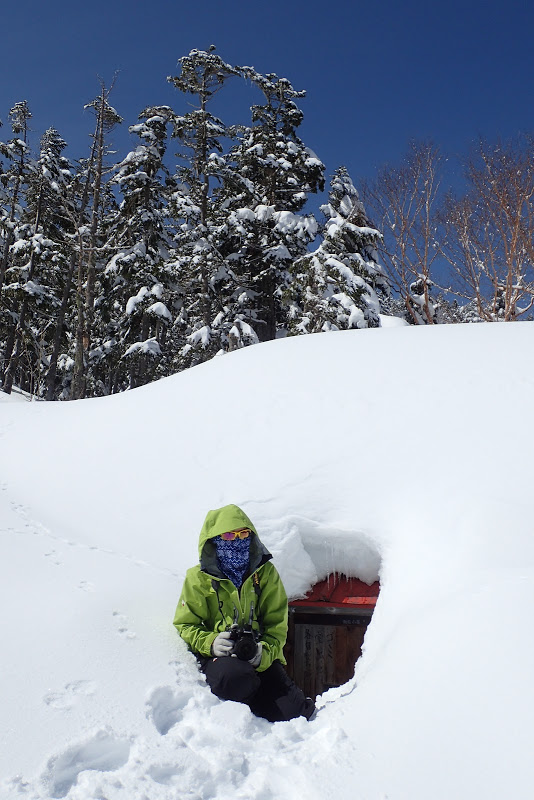 ヒョコッと現れた赤い屋根のかわいい小屋は屋根まで雪に覆われている。南部とは思えない積雪だ。 冬季小屋の扉も雪に埋もれている。