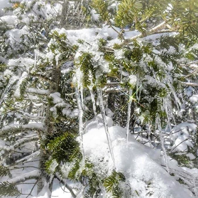 下山する程に風も落ち着き、樹林帯に入ると樹氷・・・というより枝という枝にツララが垂れ下がりクリスマスの様。 静かな森にキツツキの音が時折響く、春の兆しを思わせる下界に下りて行きました。