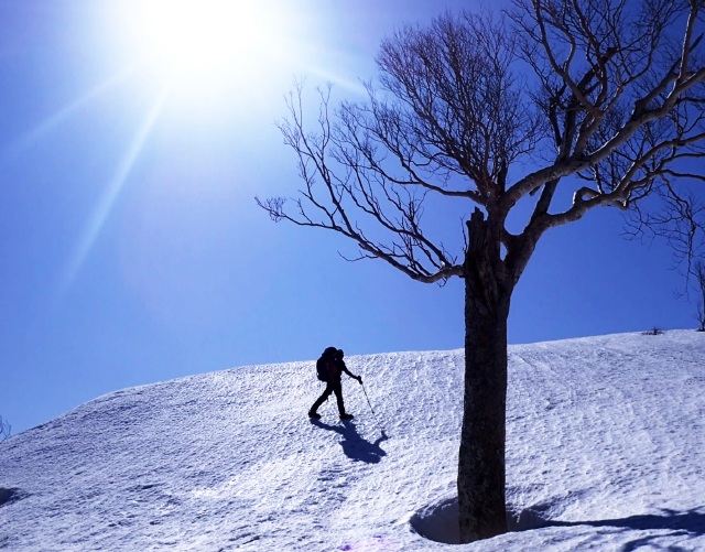 12月に来た時は、ラッセルに体力を奪われたが、今回は適度に締まってて、ワカンも不要。2400Mのピークまでツボ足で登る。