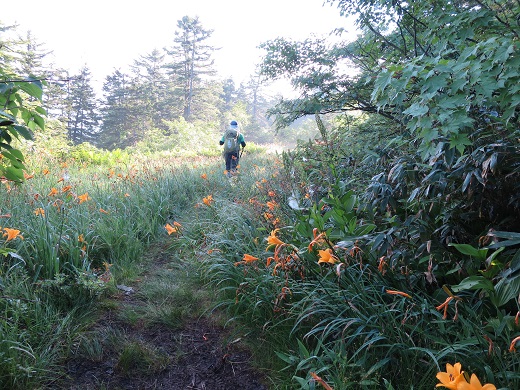 樹林帯のアップダウンを幾度となく繰り返し、2時間程で仙人峠を越えるとニッコウキスゲのお花畑が出迎えてくれました! ちなみに、仙人峠はかつて登山ルートとして使われた神岡新道と飛越新道の分岐点ですが、飛越新道がメインルートとなって以降、神岡新道は荒廃したようで、今は通行困難な状況とか!