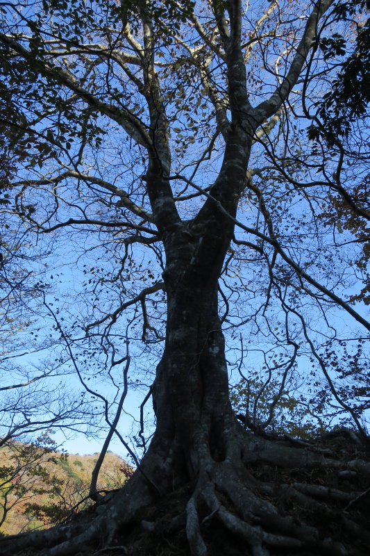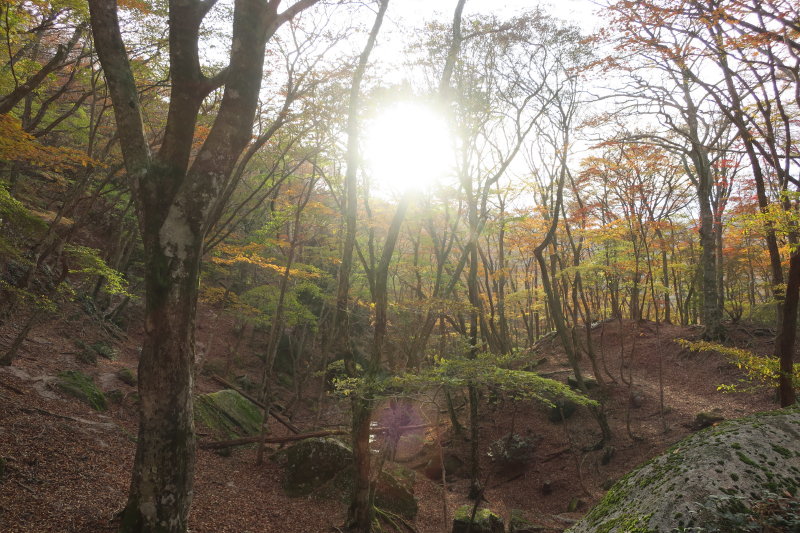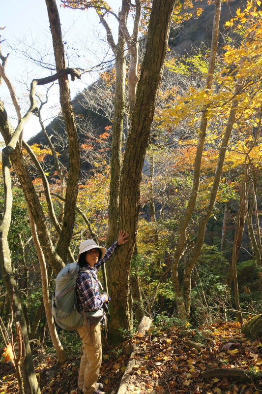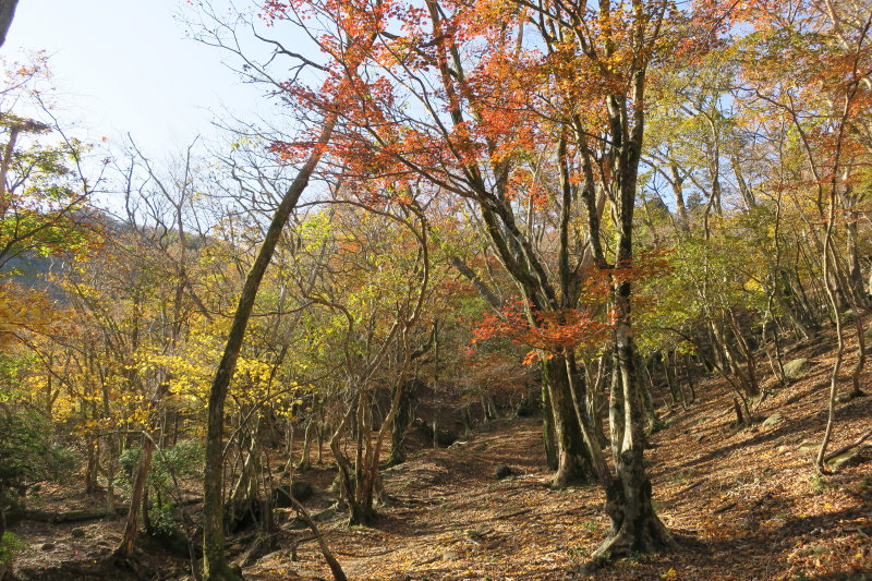 ヤシオ尾根からブナ清水への下降路に入ると、見事に色付いた二次林が出迎えてくれた。