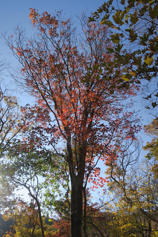 まだ少し早いのか、今年はダメなのかわからないが、それでもそれなりに色付いた木々の赤や黄が、谷間に差し