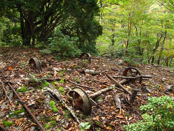私はどこで教えてもらったのだろうしばらく上るとトロッコの車輪に線路、ウインチが散乱した平地に着く。風折滝に下りてくる西尾根にもウインチがあるので、架線でこことつながっていたのだろう。ただ、トロッコはどこからどこまでつながり、何を運んだのかわからない。